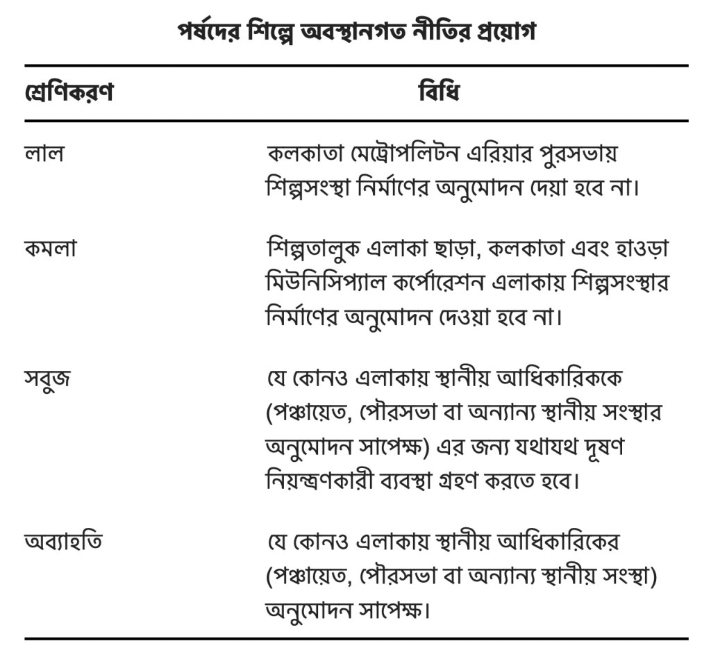 উপরিউক্ত লাল, কমলা ও সবুজ শ্রেণিভুক্ত শিল্প সংস্থাগুলির ক্ষেত্রে পঞ্চায়েতের কাছ থেকে ছাড়পত্র পাবার পরই পর্ষদের কাছে ছাড়পত্র নেবার জন্য আবেদন করা যাবে। অব্যাহতি শ্রেণির ক্ষেত্রে পর্ষদের ছাড়পত্রের প্রয়োজন হবে না।