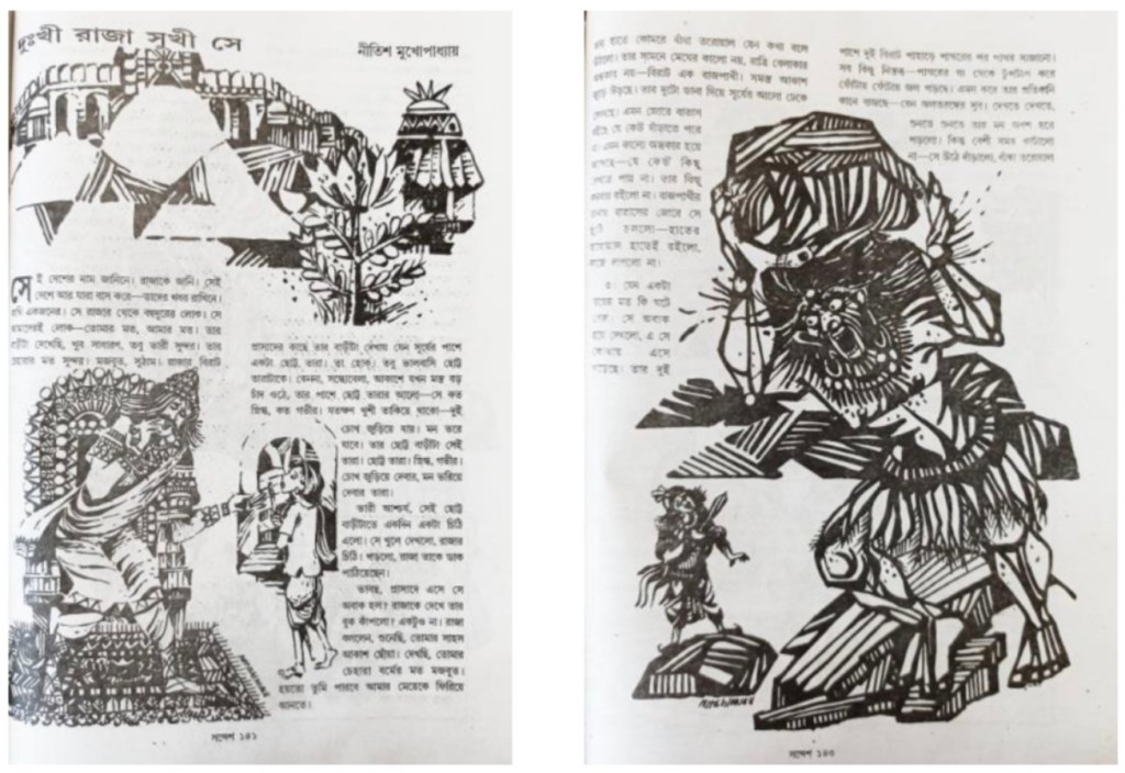 আবার, অতি সম্প্রতি, ১৪১৭ বঙ্গাব্দ অর্থাৎ ২০১০ খ্রিস্টাব্দের ‘শারদীয়া সন্দেশ’ পত্রিকায় নীতিশ মুখোপাধ্যায় রচিত ‘দুঃখী রাজা সুখী সে’ শীর্ষনামের একটা ‘কমিক্স’ স্থান পেয়েছে। সচরাচর কমিকস বলতে যে চিত্র তৎক্ষণাৎ চিন্তন-প্রক্রিয়ায় মানসচক্ষে ভেসে ওঠে, এই কমিকস কিন্তু সেইরকম নয়।