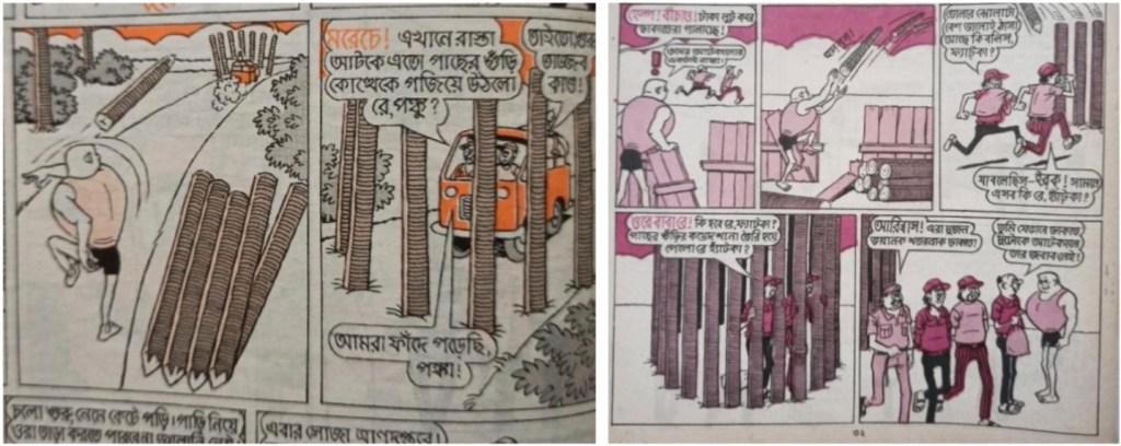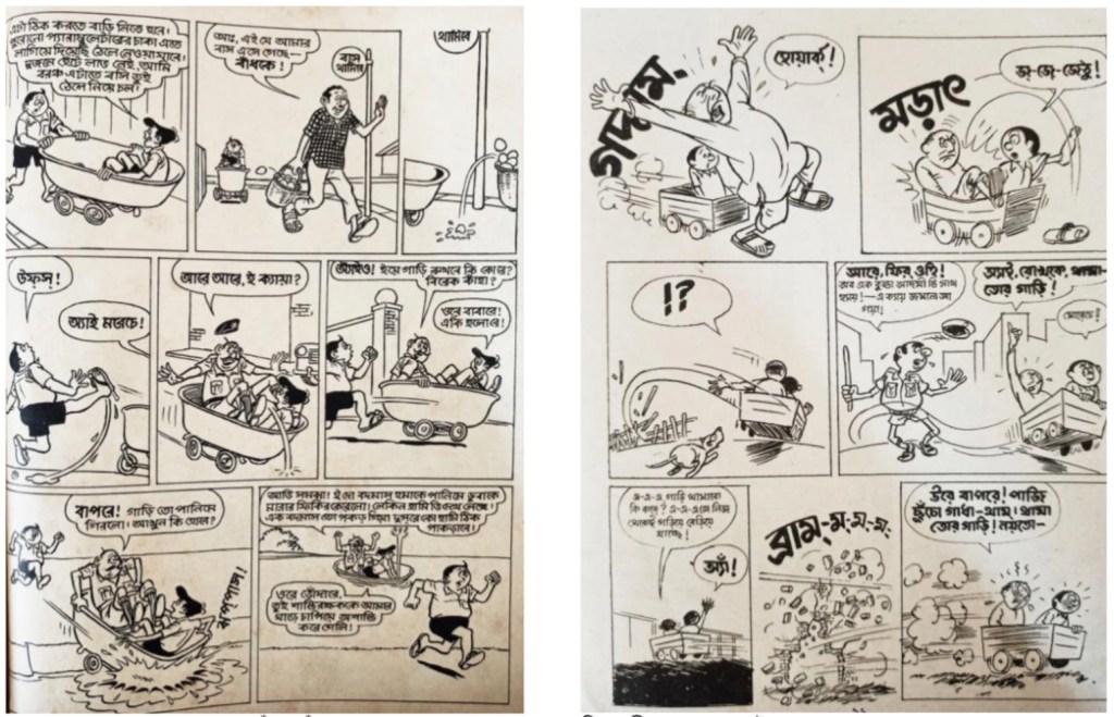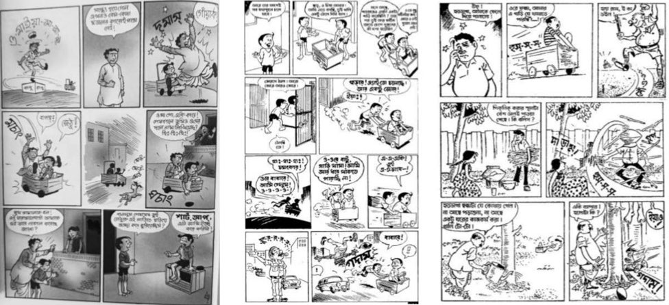 [তথ্যসূত্র: যথাক্রমে নারায়ণ দেবনাথ, ‘হাঁদা ভোঁদার কাণ্ডকারখানা: ৫’ (কলকাতা: দেব সাহিত্য কুটীর, প্রকাশকাল নেই), ১২। এবং দিলীপ দাস, ‘চুনো পুঁটি’ (কলকাতা: উজ্জ্বল কমিকস, প্রকাশকাল নেই), ৬।]